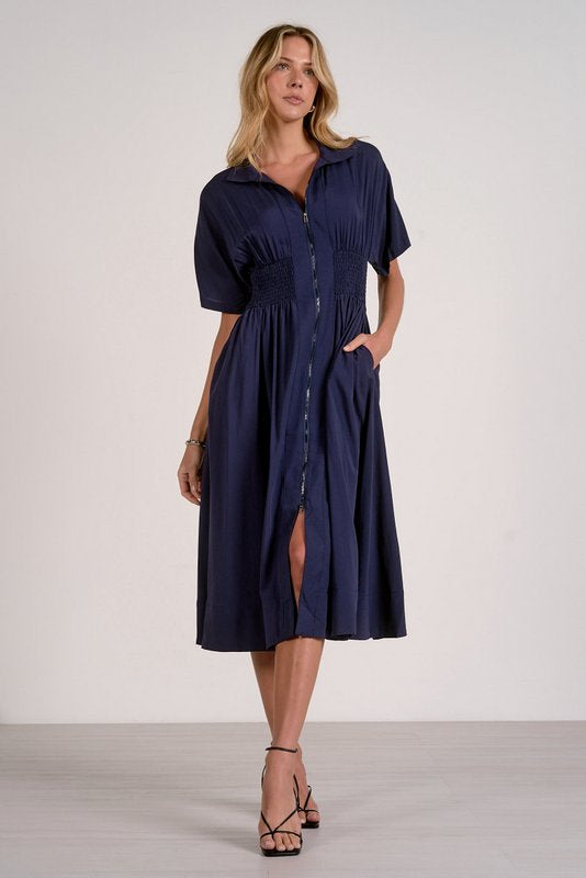 An effortless silhouette with elevated edge. The Elle dress features a flowing midi skirt and a smocked waistband that defines the shape while offering all-day comfort. The short-sleeve design and relaxed fit create a breezy, flattering look perfect for sunny days or transitional layering.