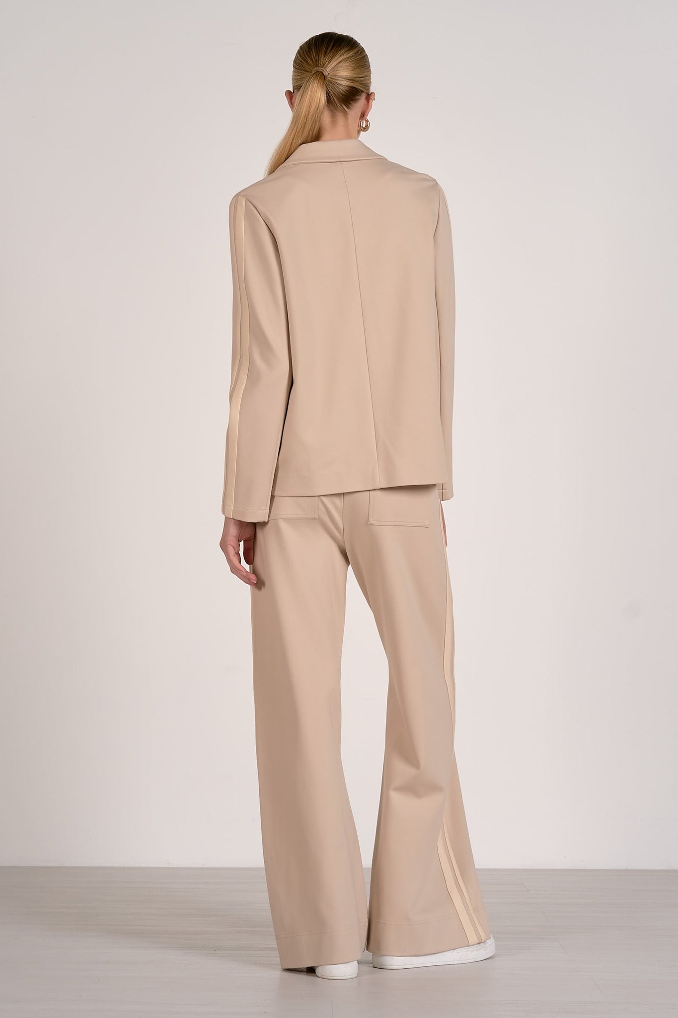 Step into sleek sophistication with the Scottie jacket. Tailored like a classic blazer but reimagined with sporty edge, this lightweight layer features a relaxed fit, notched collar, and structured shoulders for effortless polish. Finished with contrast athletic striping along the sleeves, it’s a modern take on suiting that blends leisure and luxury. Pair it with the matching track pant for a street-chic, coordinated set or dress it down with denim and sneakers for everyday cool.