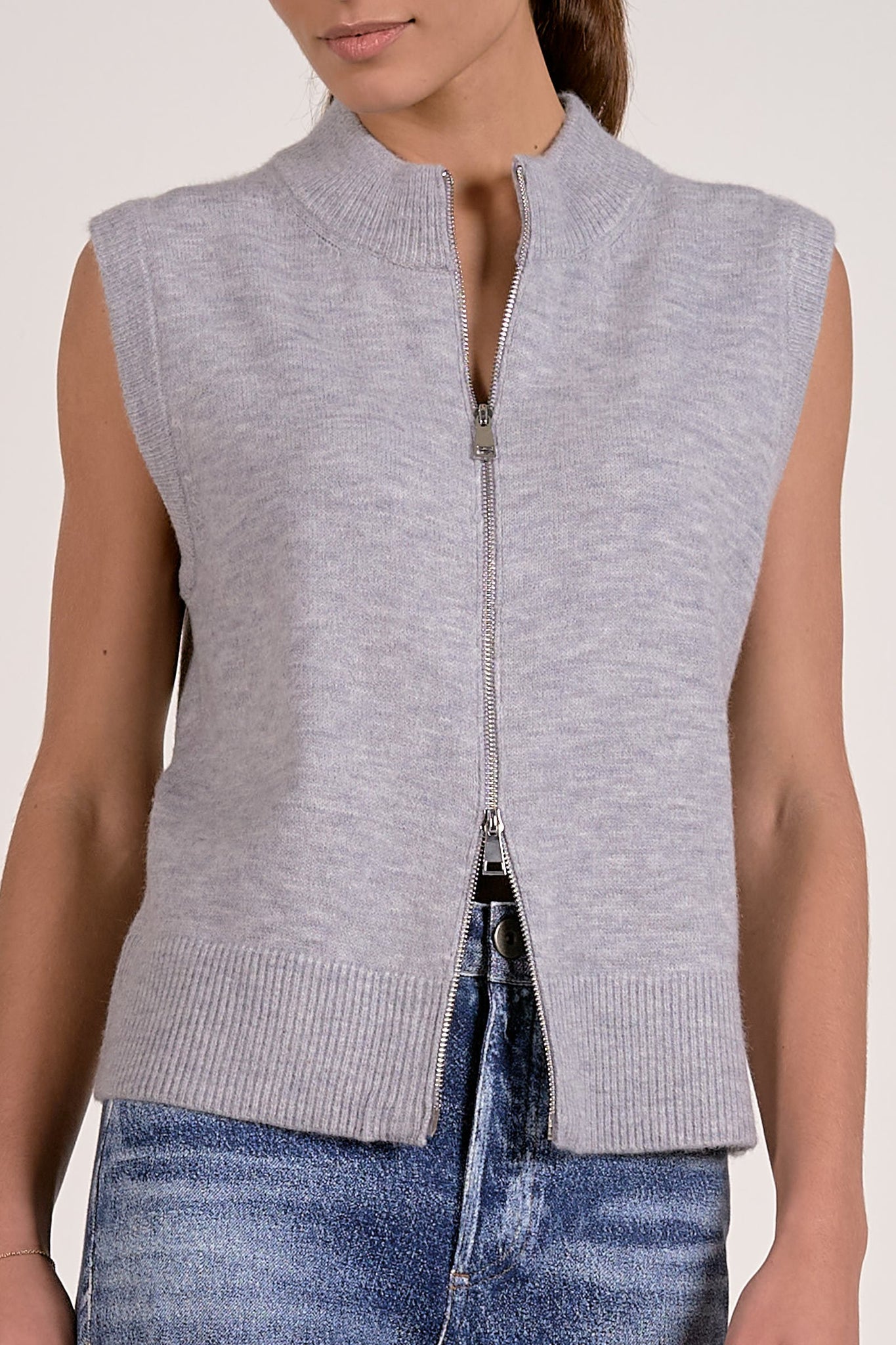 Sporty becomes elevated in the Britt sweater — a sleeveless zip-up knit that blends relaxed tailoring with a touch of polish. Designed with a high collar and full-length front zipper, this piece is perfect for transitional dressing. Style it zipped up with wide-leg pants or wear it open over a cropped tank for a laid-back, spring-ready look.