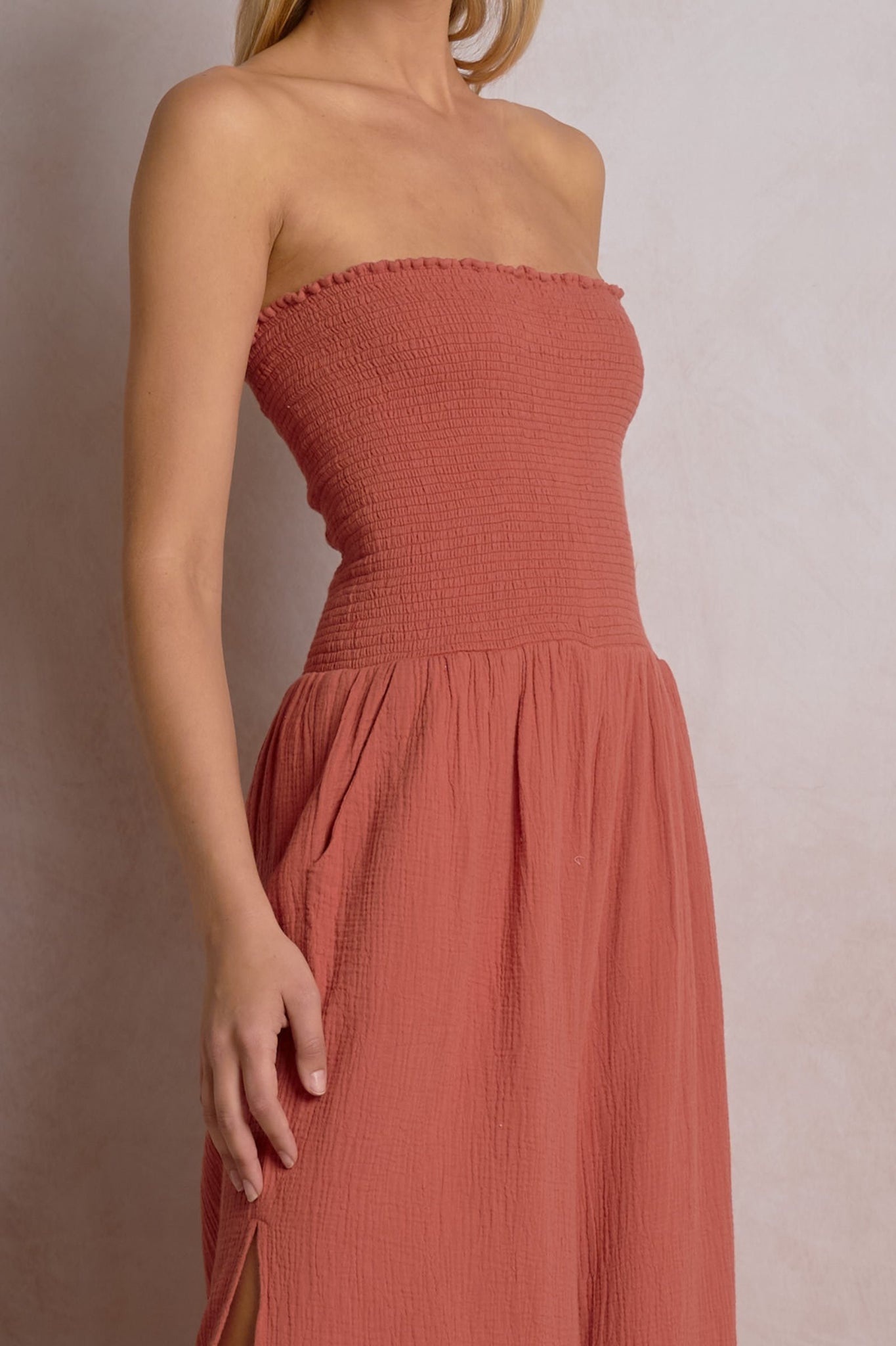 The Dominica Jumpsuit is an effortless, resort-ready strapless smocked jumpsuit made from breathable 100% cotton with a relaxed wide-leg fit. Designed for easy summer dressing, this strapless cotton jumpsuit styles perfectly with flat sandals and a straw tote for daytime, or dressed up with wedges and gold jewelry for vacation dinners and warm-weather nights.