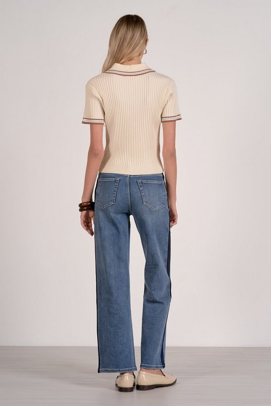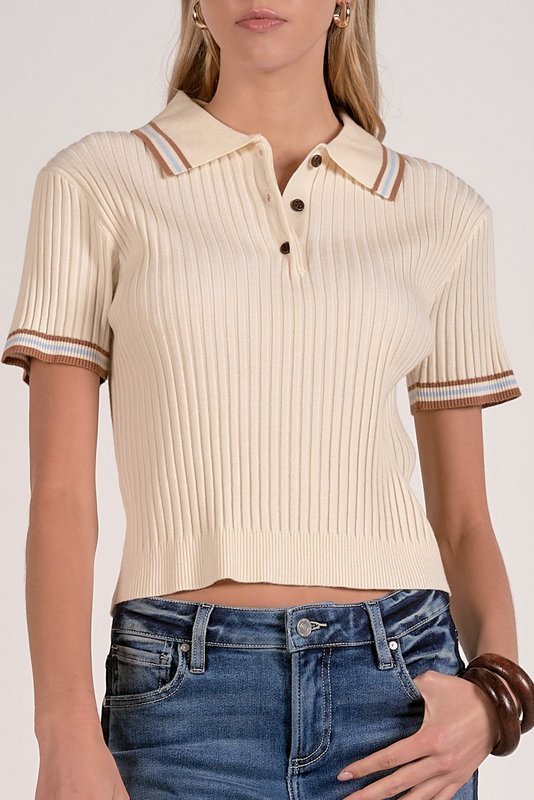 Polished yet playful, the Penelope sweater is a short-sleeve knit polo with a refined point collar and easy button placket. Ribbed throughout for texture and stretch, it delivers a flattering fit with a nod to retro prep. Pair it with trousers, a pleated midi to add a tailored twist to your spring rotation.