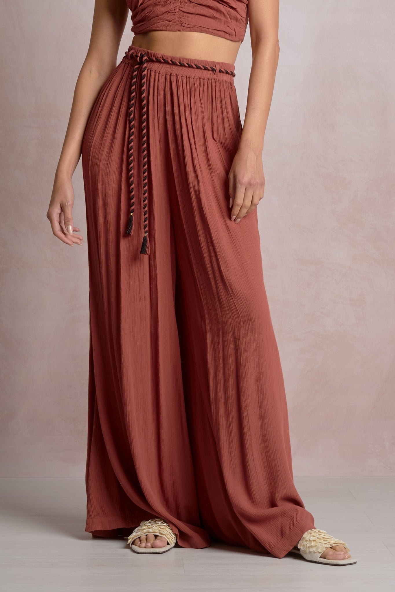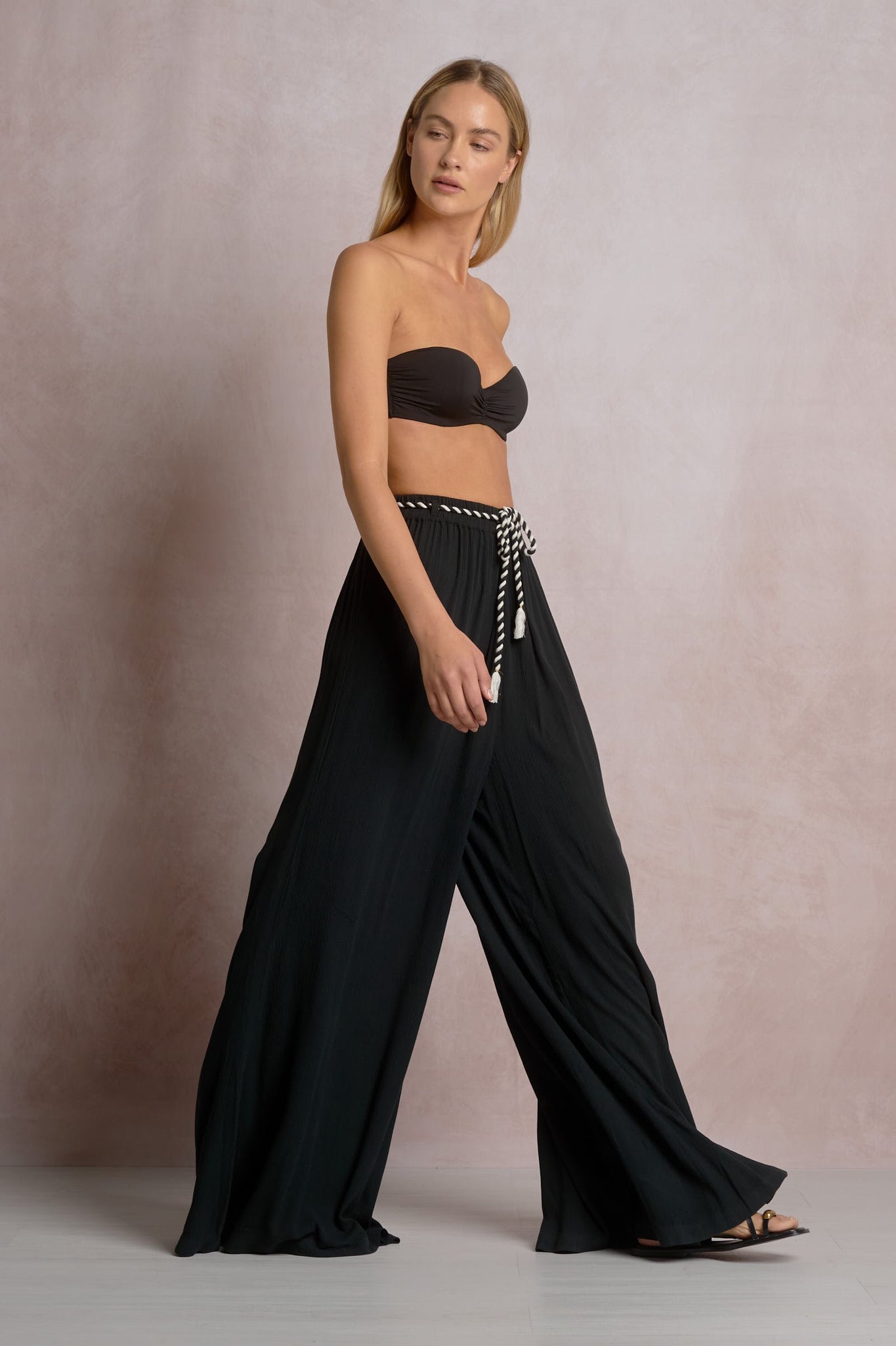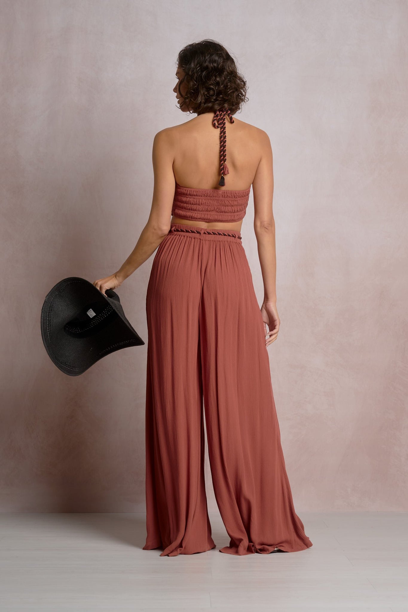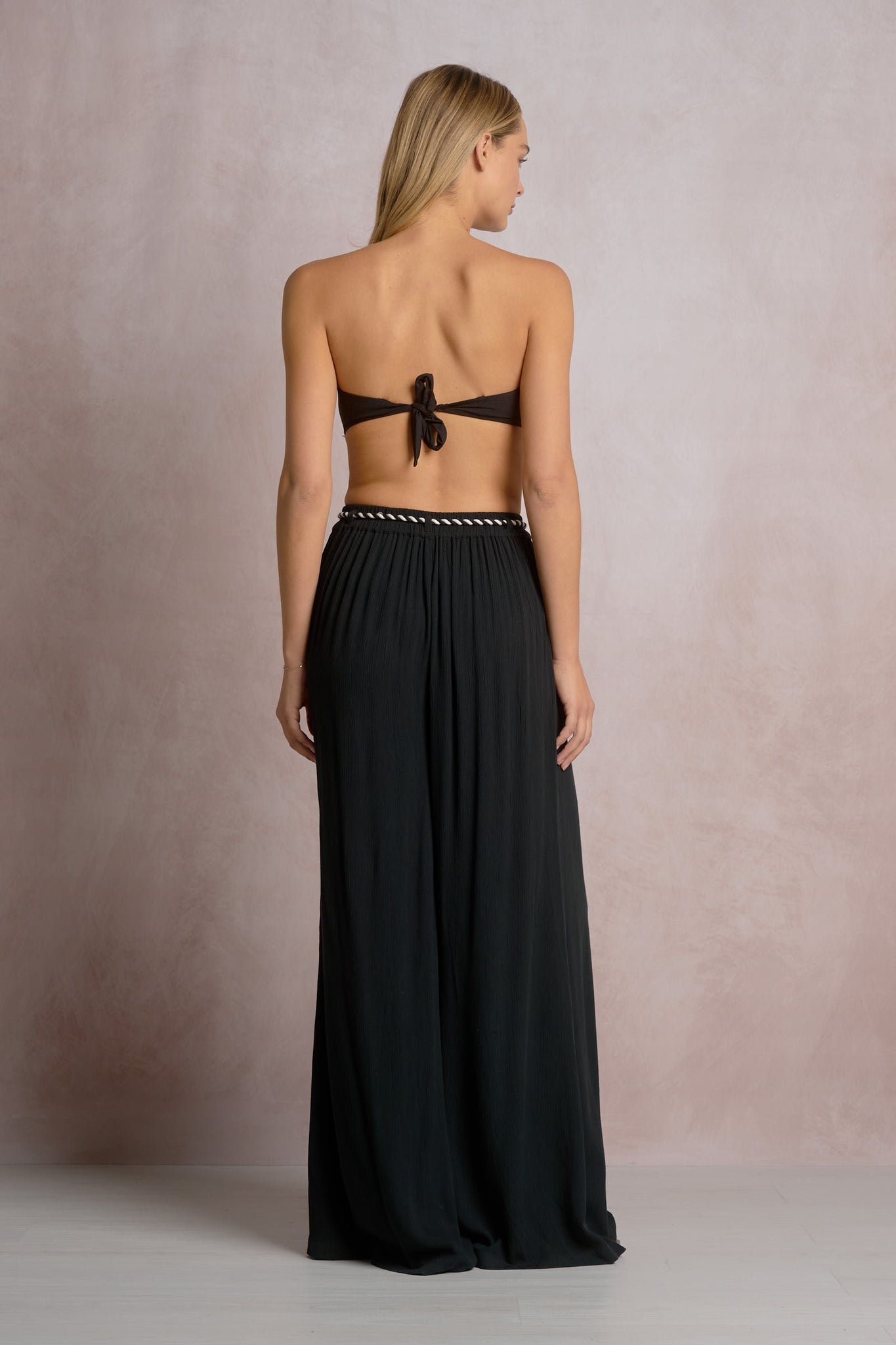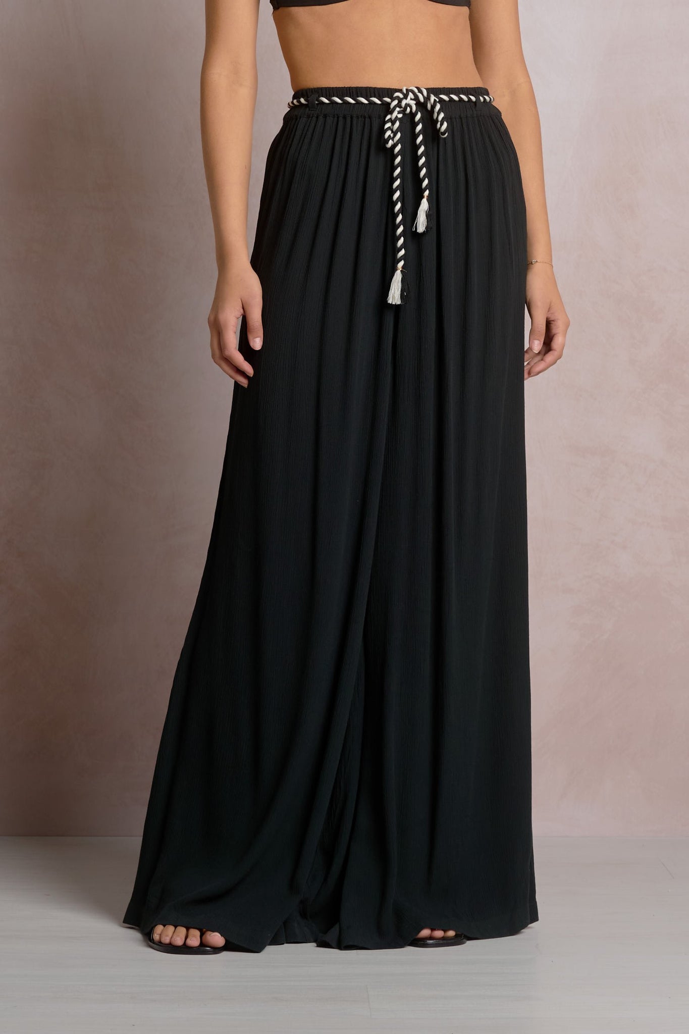 The Raia Pants are an effortless, resort-ready wide leg pant featuring a flattering rope tie waist and a relaxed drape in lightweight 100% rayon. Designed for easy day-to-night styling, these flowy pants pair perfectly with a fitted tank, or a strapless top, finished with flat sandals for vacation days or heels for dinner.