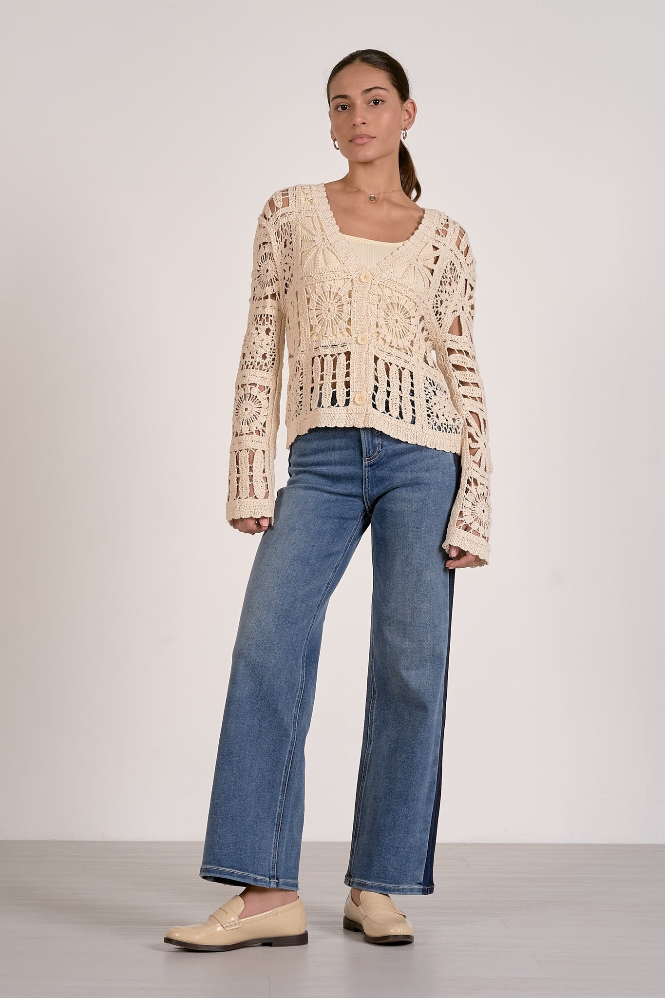 An airy open-knit cardigan made for sunlit spring layers. The Shay sweater features intricate crochet-inspired stitching with a relaxed, boxy silhouette and dropped shoulders for a laid-back look. Perfect for throwing on over a tank with denim, this piece balances texture with breathability making the Shay sweater the ideal transitional knit.